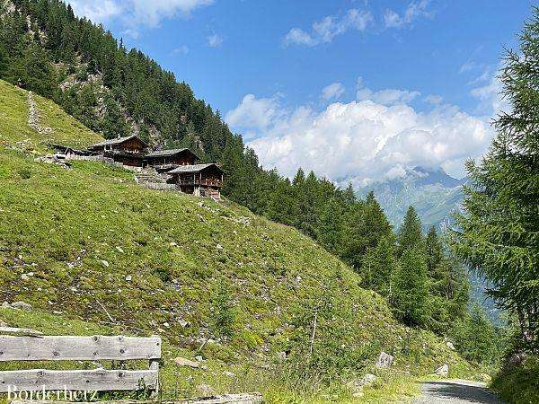 Unser Weg führt uns gegen den Uhrzeigersinn zunächst noch auf einem leicht begehbaren und asphaltierten Wegstück an einem einsam gelegenen Bauernhof vorbei. Von den leuchtend grünen Wiesen blicken wir in das malerische Virgental. Ein paar Schritte weiter hüllt uns der urtümliche Bergwald ein. Der Boden ist dicht bewachsen mit Farnen, Gräsern und violett schimmernden Disteln, auf denen sich farbenfrohe Schmetterlinge tummeln. Hohe Fichten und Lärchen ragen vor uns auf. Ihre knorrigen Wurzeln regen die Fantasie an.