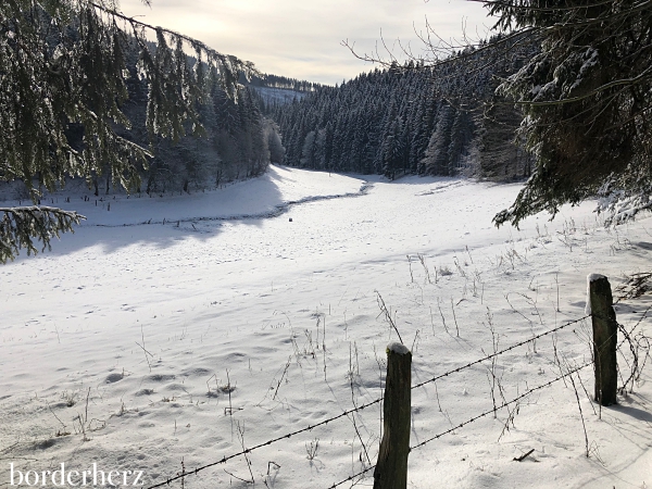 Auf den wunderschönen Winterwegen, vorbei am Skihang und zwischen den weißen Tannen wandern wir in einem Bogen um den Kahlen Asten, um dann an einer spitzen Kreuzung scharf rechts ab zu biegen.